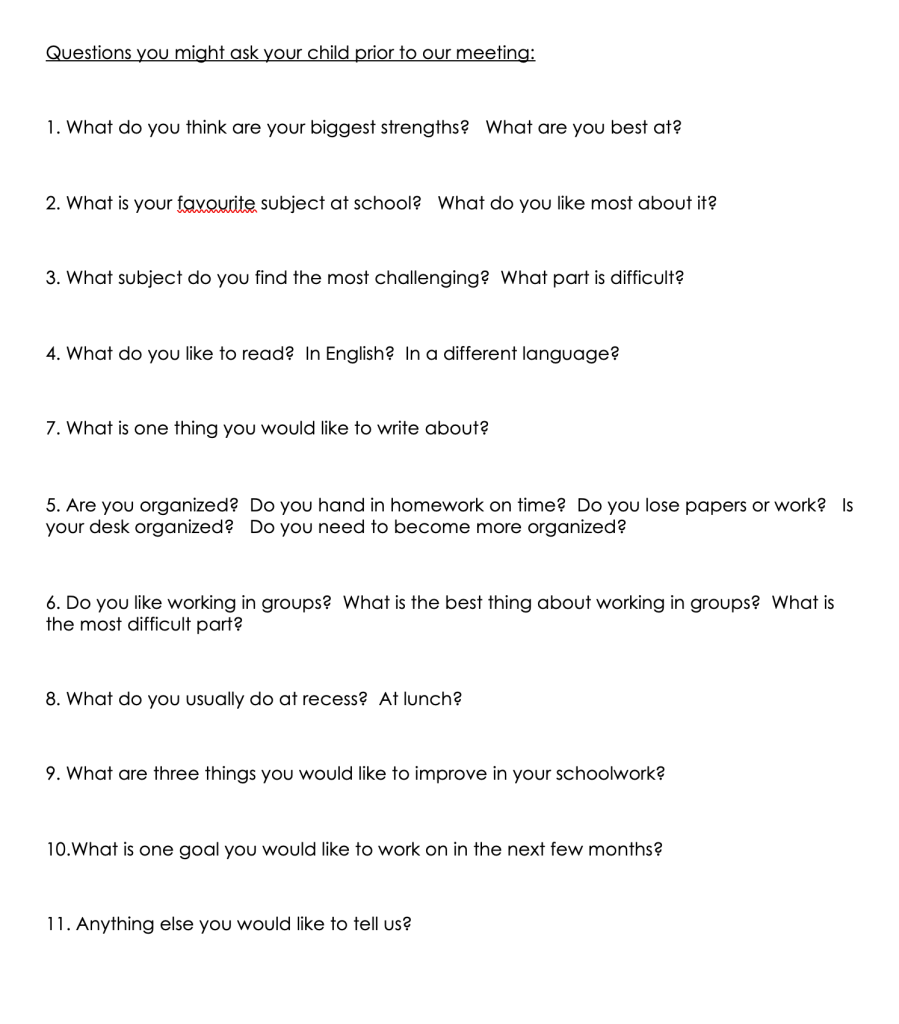 Parents or caregivers then share how they are doing with the weekly conferences where students review their binder and activities from the week and if there are any questions about what they see in the binder. Most respond that they are happy to see what is happening and more often wonder about homework expectations and how to support their child in French Immersion.